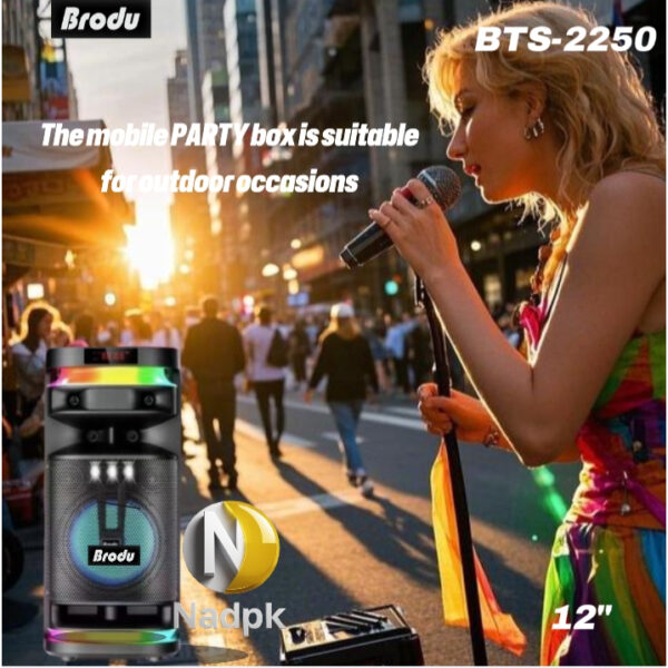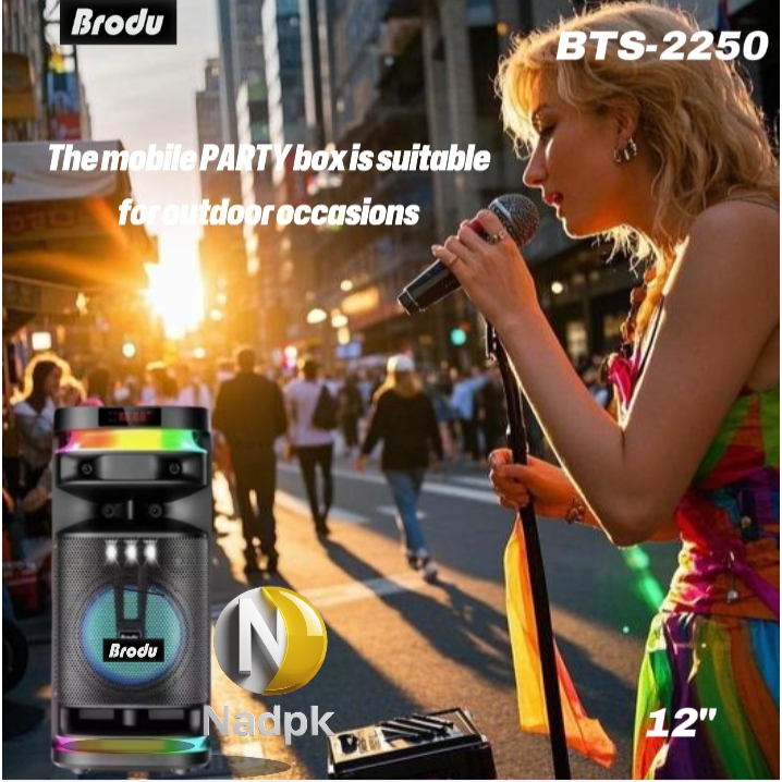 The BTS-2250 is a high-power portable Bluetooth karaoke speaker designed for parties, events, and professional use. It delivers loud, clear sound with deep bass, making it suitable for indoor and outdoor gatherings.