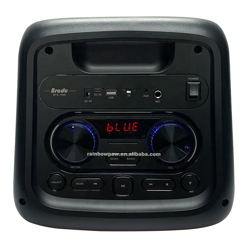 The BTS-1908 is a high-power portable karaoke Bluetooth speaker designed for parties, events, and professional use. It features a large dual-speaker system with RGB LED lighting, delivering loud, clear sound with strong bass. The dynamic LED light panel enhances the party atmosphere, making it perfect for indoor and outdoor gatherings.
